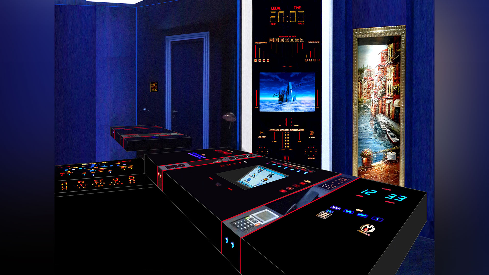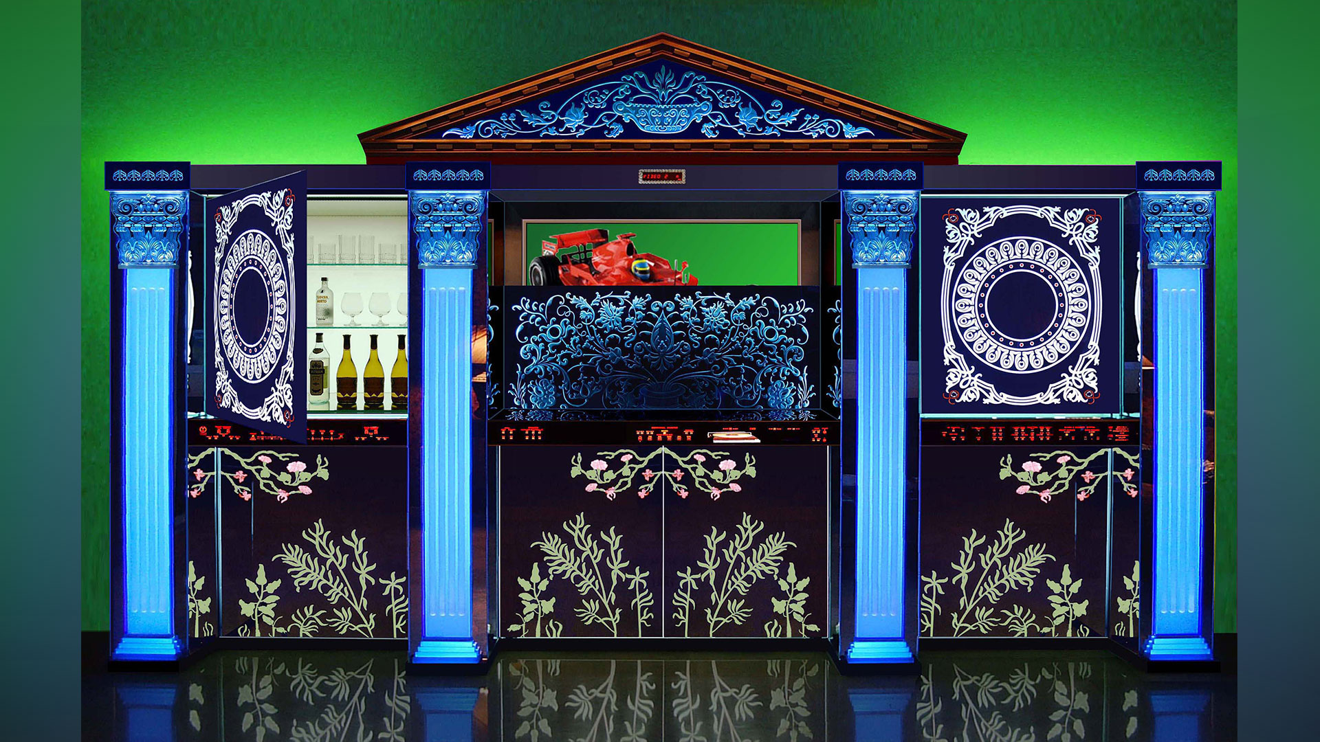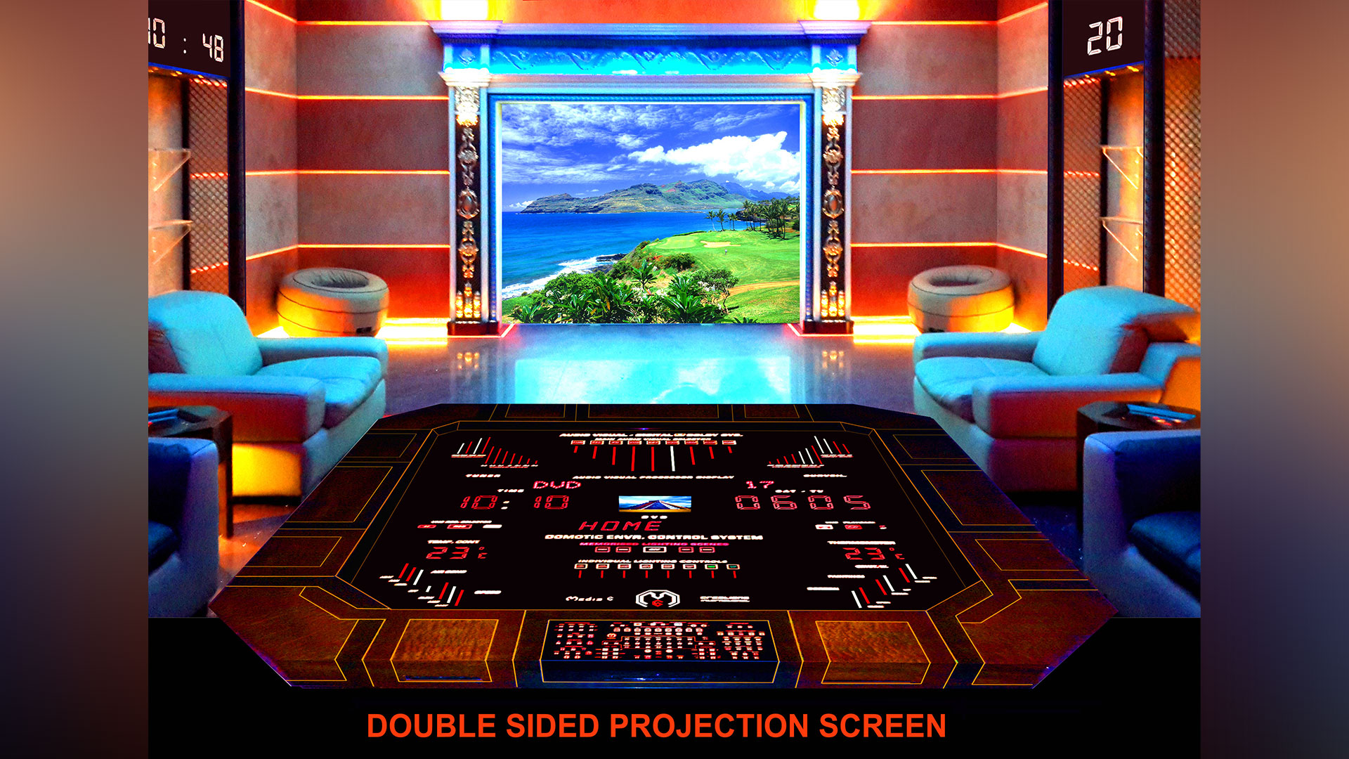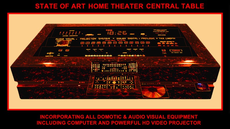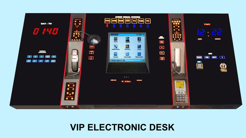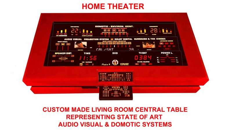 The luminous displays on all our avant-garde units disappear when the system is switched off, becoming a uniform black glass finish. This approach enables the integration of all possible electronic systems in any interior, as one central discreet unit, without spoiling the purity of an interior. These creations are the solution to the problem of unattractive TV sets, projectors, video equipment and speakers by introducing artistic and futuristic home entertainment systems into today’s interiors, providing the most user friendly control, no matter how complex the system may be.